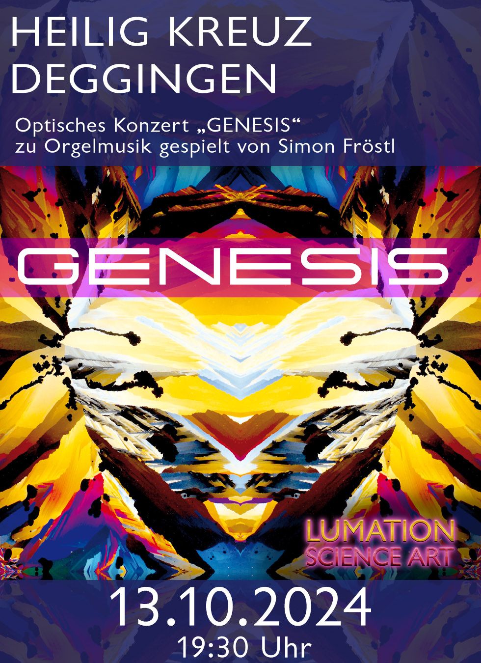 Lumation Science Art spielt ihre Live-Performance interaktiv zur ebenfalls live erklingenden Orgelmusik von Simon Johannes Fröstl, der sowohl Orgelliteratur aus verschiedenen Epochen bis hin zur Filmmusik zu Gehör bringen wird, als auch in Improvisationen die optischen Eindrücke in die Sprache der Musik übersetzt. Die vielfältigen klanglichen Möglichkeiten der neu sanierten Orgel kommen hier besonders intensiv zum Tragen. Die Musik verschmilzt dabei mit der faszinierenden Lichtshow und visionären Multimediakunst des Künstlerkollektivs, welche die historischen Mauern der Kirche in dieser einzigartigen Form zum Leben erwecken.
