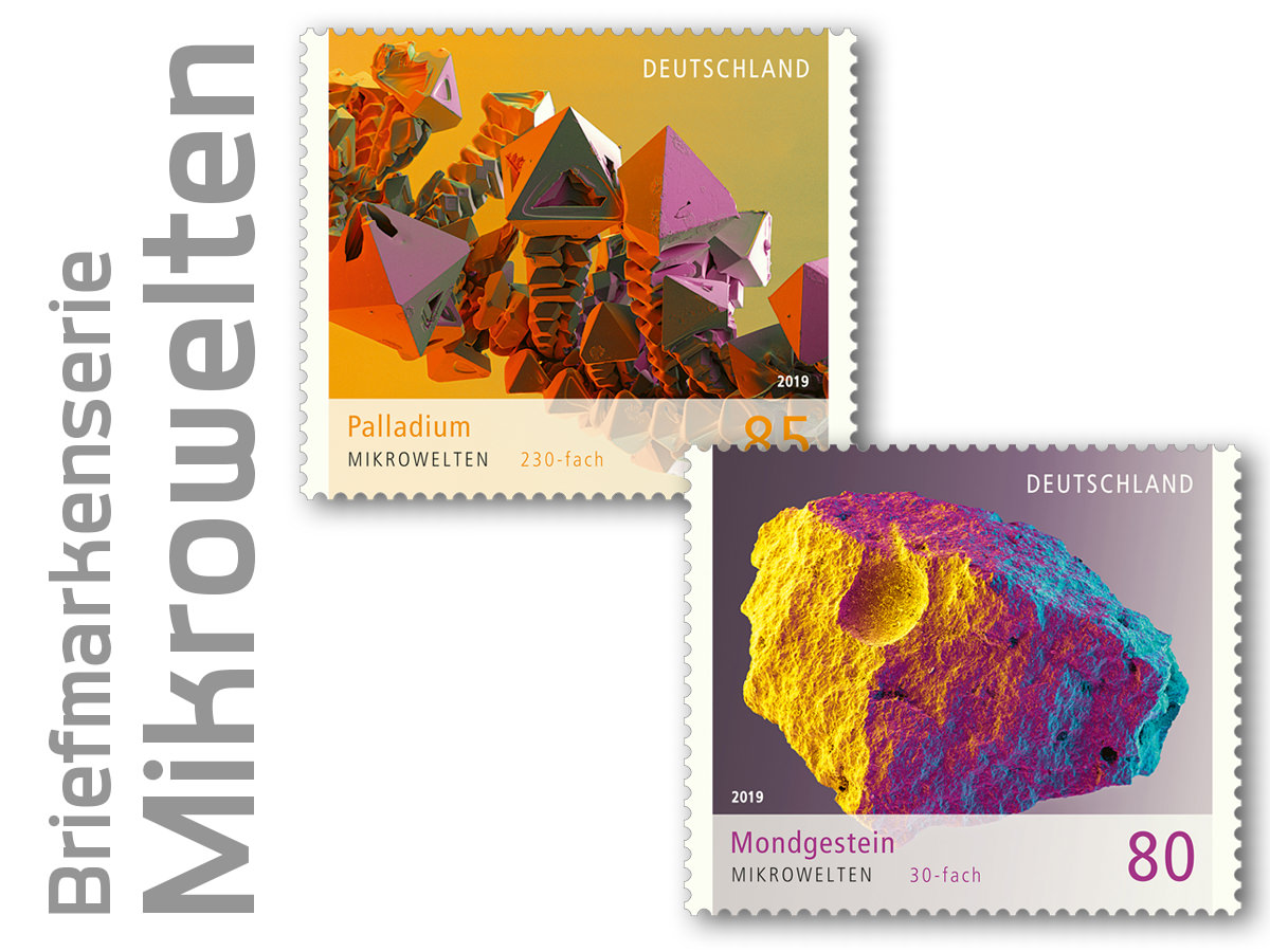 Neben den Apollo-Missionen gab es weitere Unternehmungen, um Mondgestein zu bergen. Auch die damalige Sowjetunion betrieb ein reges Raumfahrtprogramm und brachte im Zuge der Luna-Missionen zwischen 1970 und 1976 mithilfe von unbemannten Sonden insgesamt 300 Gramm Mondmaterial zur Erde. Eine dritte Quelle stellen Meteoriten dar, die durch Einschläge aus der Mondoberfläche gebrochen und bis zu uns herüberkatapultiert wurden. In 30-facher Vergrößerung und schillernden Farben schmückt das Mondgestein nun auch das neueste Sonderpostwertzeichen der Serie „Mikrowelten“. (Text: Bundesministerium der Finanzen)