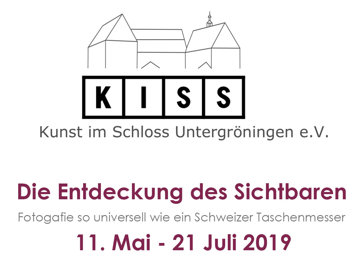 Im Rahmen seines 19. Kunst- und Kultursommers präsentiert KISS – Kunst im Schloss Untergröningen e.V. vom 11. Mai bis zum 21. Juli die Ausstellung: Die Entdeckung des Sichtbaren – Fotografie so universell wie ein Schweizer Taschenmesser. Die von Christian Gögger kuratierte Ausstellung versammelt Fotografien aus allen Bereichen: Porträt, Landschaft, Werbung, Street-Phototaphie, Reportage, Fotogramm, Sachaufnahme, Zeitdokument, Serie, analytische und subjektive Fotografie, aktuelle wie historische Aufnahmen etc.