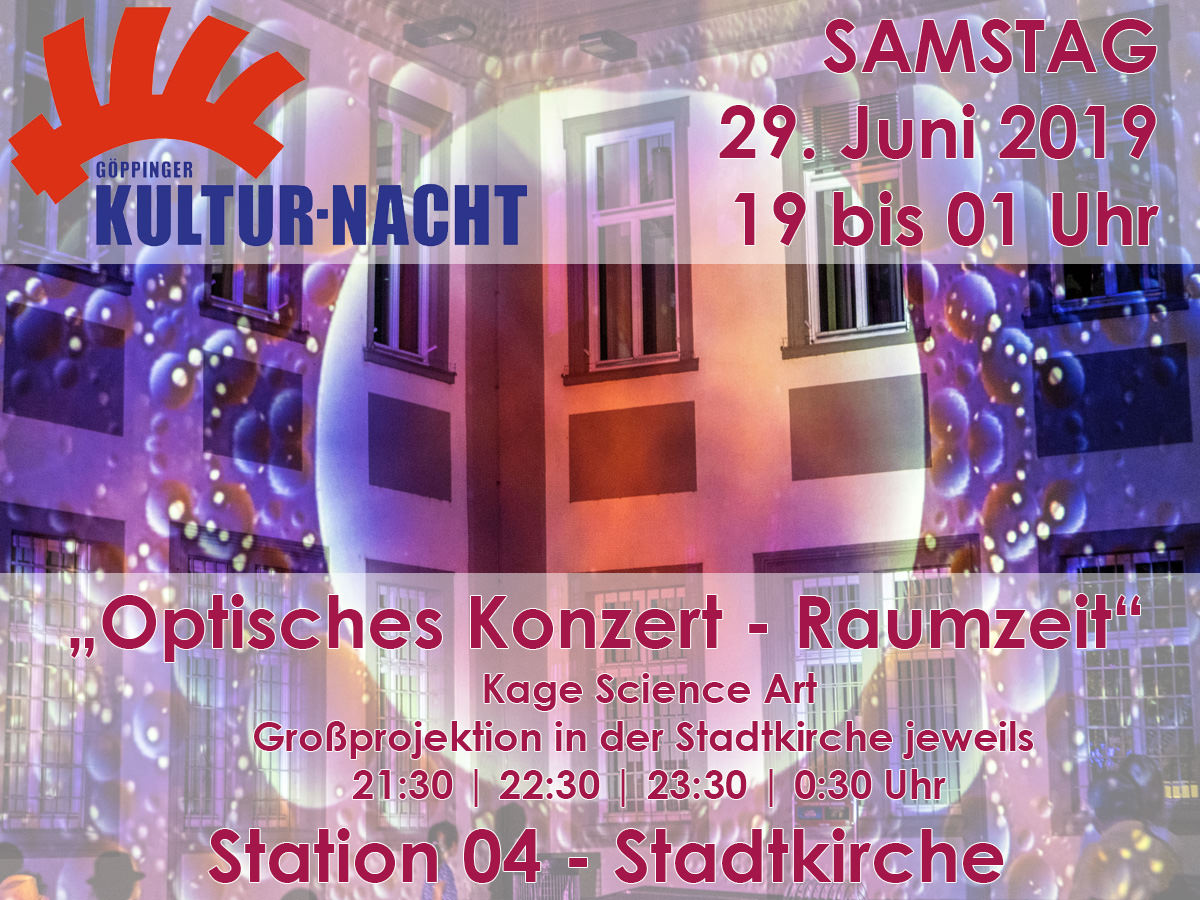 Innerhalb der Kulturnacht 2019 in Göppingen wird die Familie Kage einen Teil des Innenbereichs der Stadtkirche mit Ihrem „Optischen Konzert – Raumzeit“ bespielen.