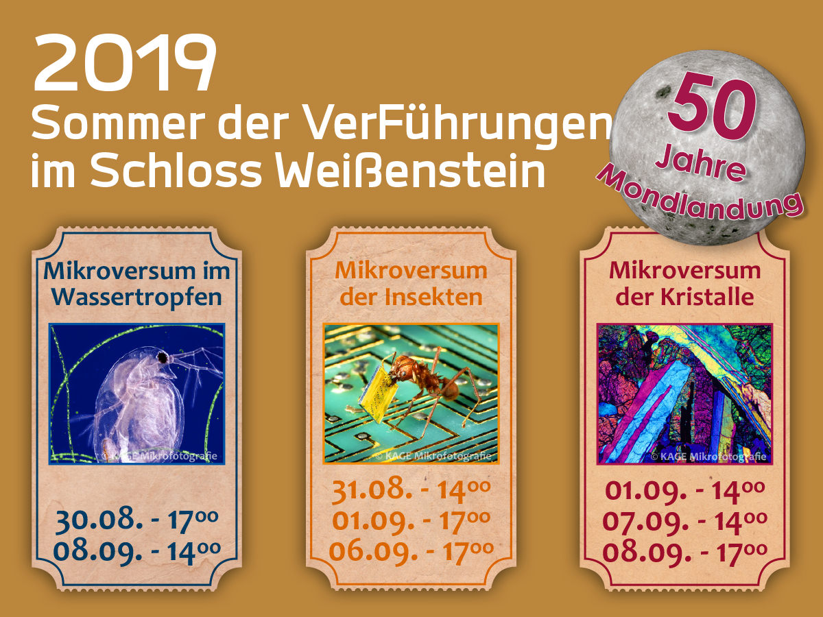 Sonderführung in KAGEs MIKROVERSUM zum diesjährigen Kage-Instituts- und Mondlandejubiläum. Führungs-Reise durch den Mikro- und Makrokosmos mit einer spannenden Multivisionsshow, der Präsentation der ersten 1971 veröffentlichten farbigen Mondgesteinsaufnahmen Manfred P. Kages und die Präsentation von weiteren „Besuchern“ aus dem Weltall. Zum gemütlichen Ausklang werden themenbezogene kulinarische Genüsse gereicht.