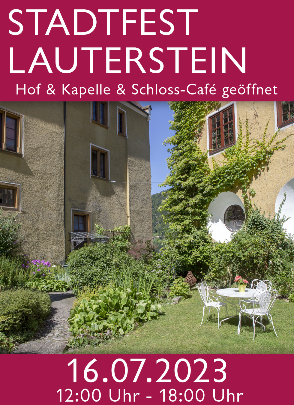 Zum 31. Lautersteiner Stadtfest öffnen wir am Sonntag den 16.07.23 von 12:00 Uhr bis 18:00 Uhr den Schlosshof, die Kapelle, den SchlossShop sowie unser Open-Air-Schloss-Café (SB).