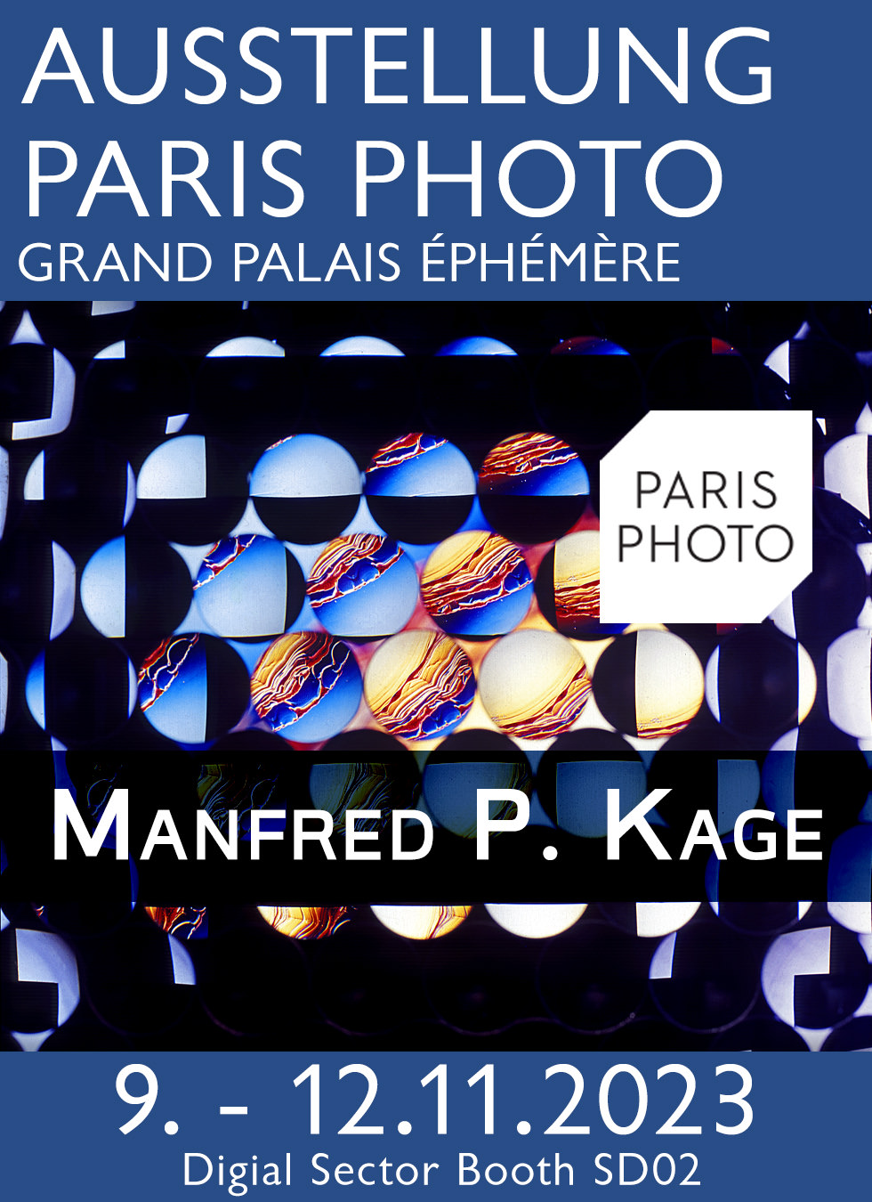 Innerhalb der diesjährigen Paris Photo (9.11.-12.11.23) wird die Galerie Photo Edition Berlin zusammen mit elementum.art zwei weitere NFT-Editionen Manfred P. Kages präsentieren. M. P. Kage wird in diesem Zusammenhang erneut als ein bedeutender Vertreter der Generativen Fotografie und einer der wichtigsten Pioniere der Multimediakunst vorgestellt. Weitere Informationen zu der Ausstellung und den NFT-Editionen finden Sie bei Interesse z.B. unter:
