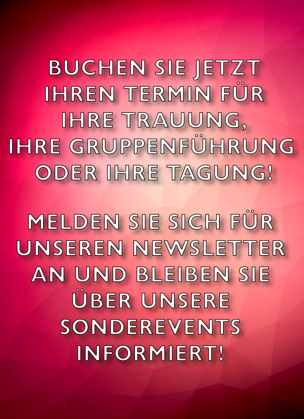 Buchen Sie JETZT Ihren Termin für Ihre Trauung, Ihre Gruppenführung oder Ihre Tagung!