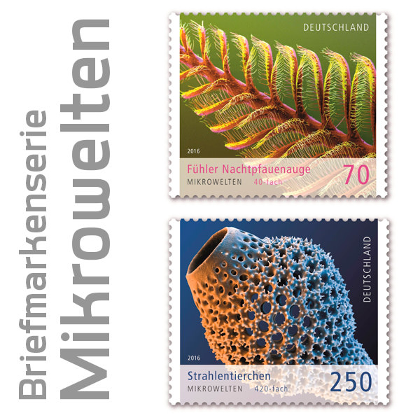 Sonderpostwertzeichen-Serie "Mikrowelten“: Fühler Nachtpfauenauge und Strahlentierchen