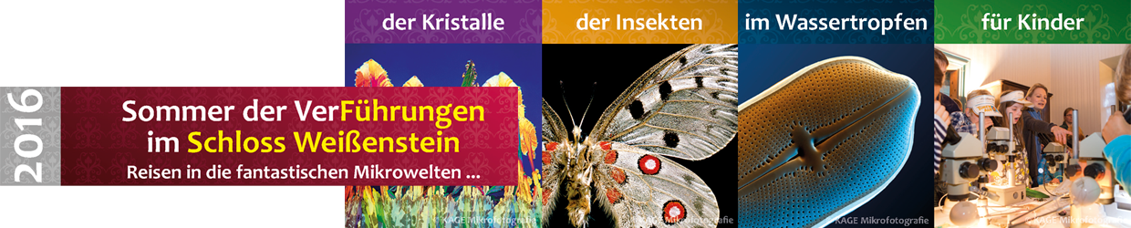 Im einzigartigen Museum für Mikrofotografie im Schloss Weißenstein zeigen wir Ihnen viele spannende Stationen über die überraschende Welt der Insekten. Die Führung enthält die Schlosskapelle, einen Gang durch die Bildergalerie, eine Ausstellung über Mikroorganismen, das Mineralienkabinett mit „Besuchern“ aus dem Weltall, ein Apothekenmuseum, die Aula mit historischen Projektoren, eine spannende Multimedia-Show und ein neu eingerichtetes Mikrotheater, in dem die Insektenwelt live in Gigagröße gezeigt wird.